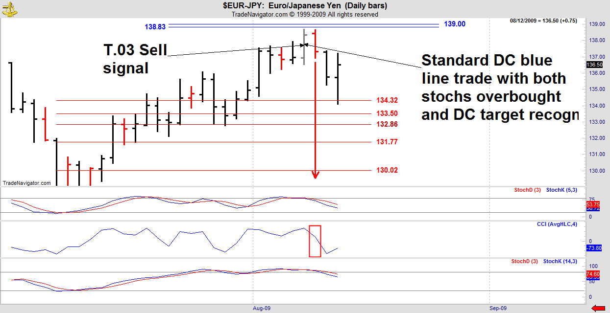 Standard DC blue line reversal setup on the Friday, with 12 ticks variance, then momentum failure on Monday to complete the picture. Market went to the 37.5% retracement, the most common number for rets in a trending market. AND a T.03 Sell signal on Friday.