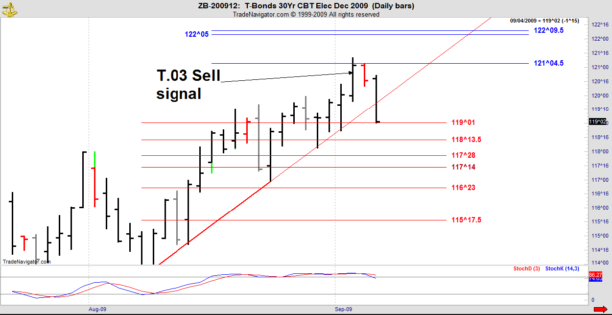 Nice T.03 trade in Bonds which broke the trendline that has been supporting it since 08/13. Note that US T Bonds is no longer trading in half ticks. See CME announcements.