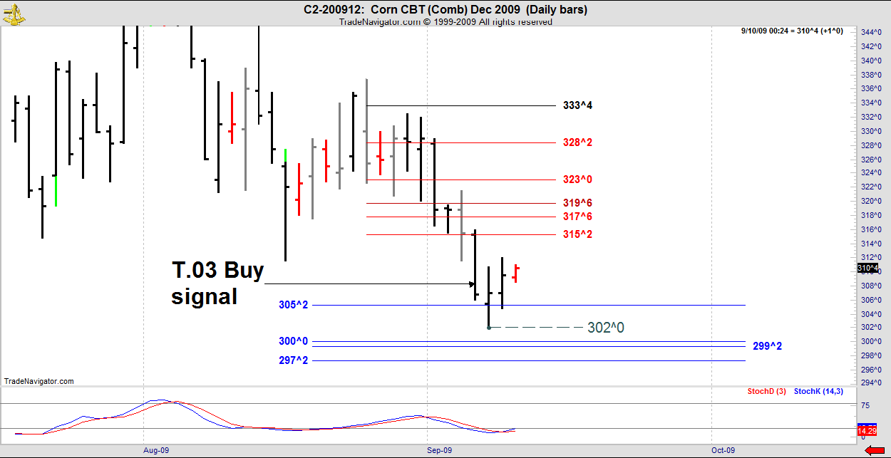 Friday’s T.03 Buy in Corn was a day early and elected on the third day. Monday’s low at 302^0 was at the DC blue line on the weekly chart. Exactly. Always be aware of the weekly chart numbers.