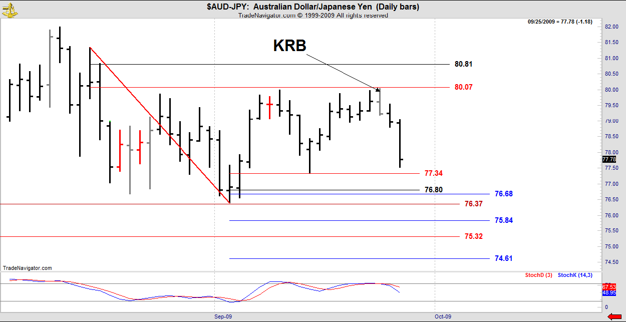 Wednesday’s KRB at DC resistance set up the Sell trade. Note that the market elected the DC rets only of the penultimate swing marked in red. Not the major swing.