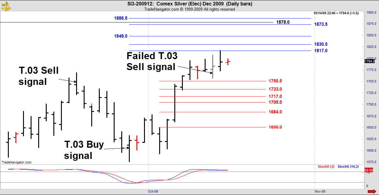 Tuesday’s T.03 Sell signal in Silver was elected and failed with an outside bar. Always take the stop and reverse with an outside bar. Probabilities are high that you will recover your initial loss.
