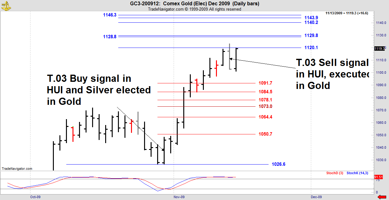 Thursday’s T.03 Sell signal in HUI gave just 1 day down in Gold. Remember that all of the Precious Metals that I cover are highly correlated so a T.03 signal in HUI can be executed in any of Gold, Silver or GLD provided that the signal is elected; and vice versa.