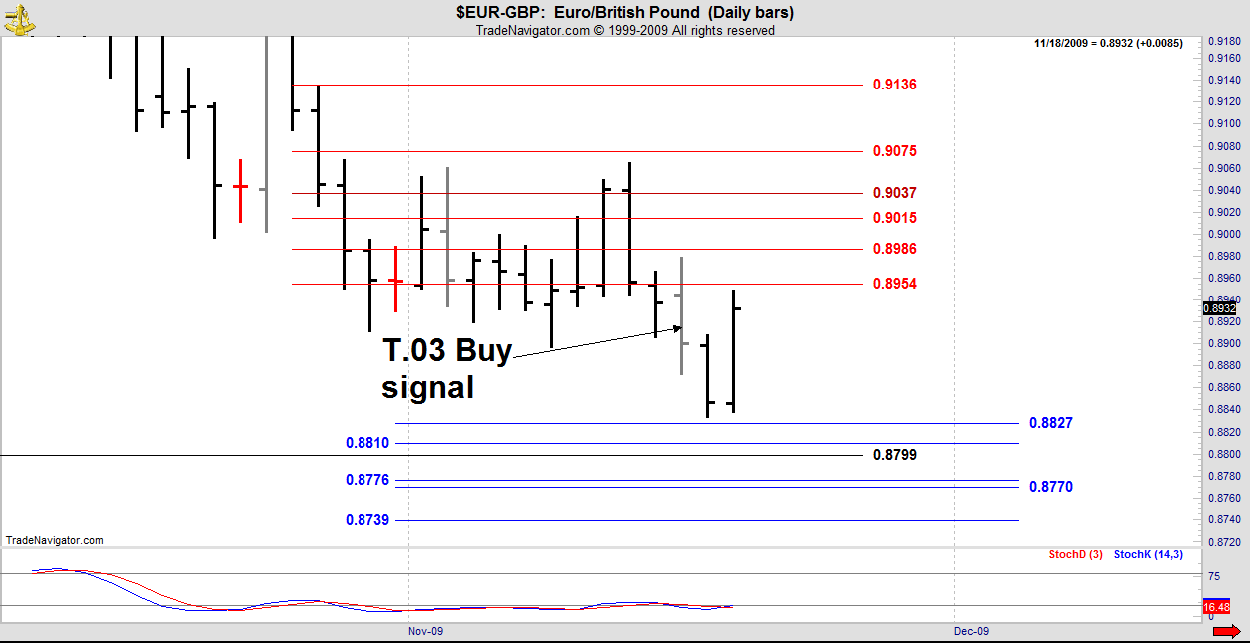 Monday’s T.03 signal was 2 days early and gave us an upside fill, only to fail with an outside bar. Always stop and reverse to trade with the outside bar. Probabilities are high that you recover the initial loss or at least soften the blow. See PowerPoints.