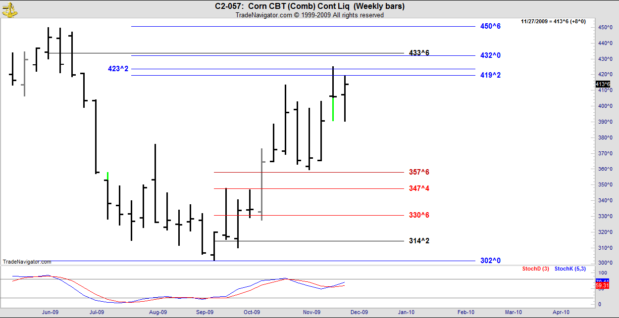 When a market ignores a Danielcode number, it will often find a way to use it subsequently. This chart is a good example as the 11/20 week ignored the 419^2 DC blue line but made it the high of the week just ended.