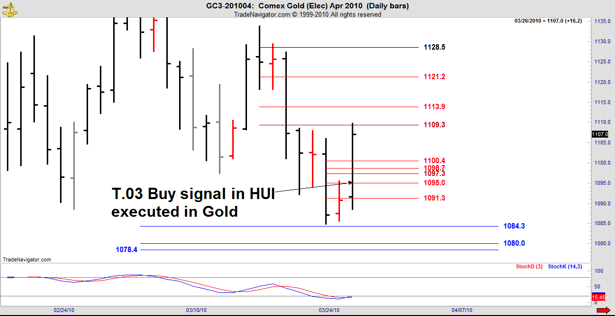 HUI, Silver and Gold are all highly correlated, so a T.03 signal in any one can be executed in any other, if it is elected. Friday was a nice example.