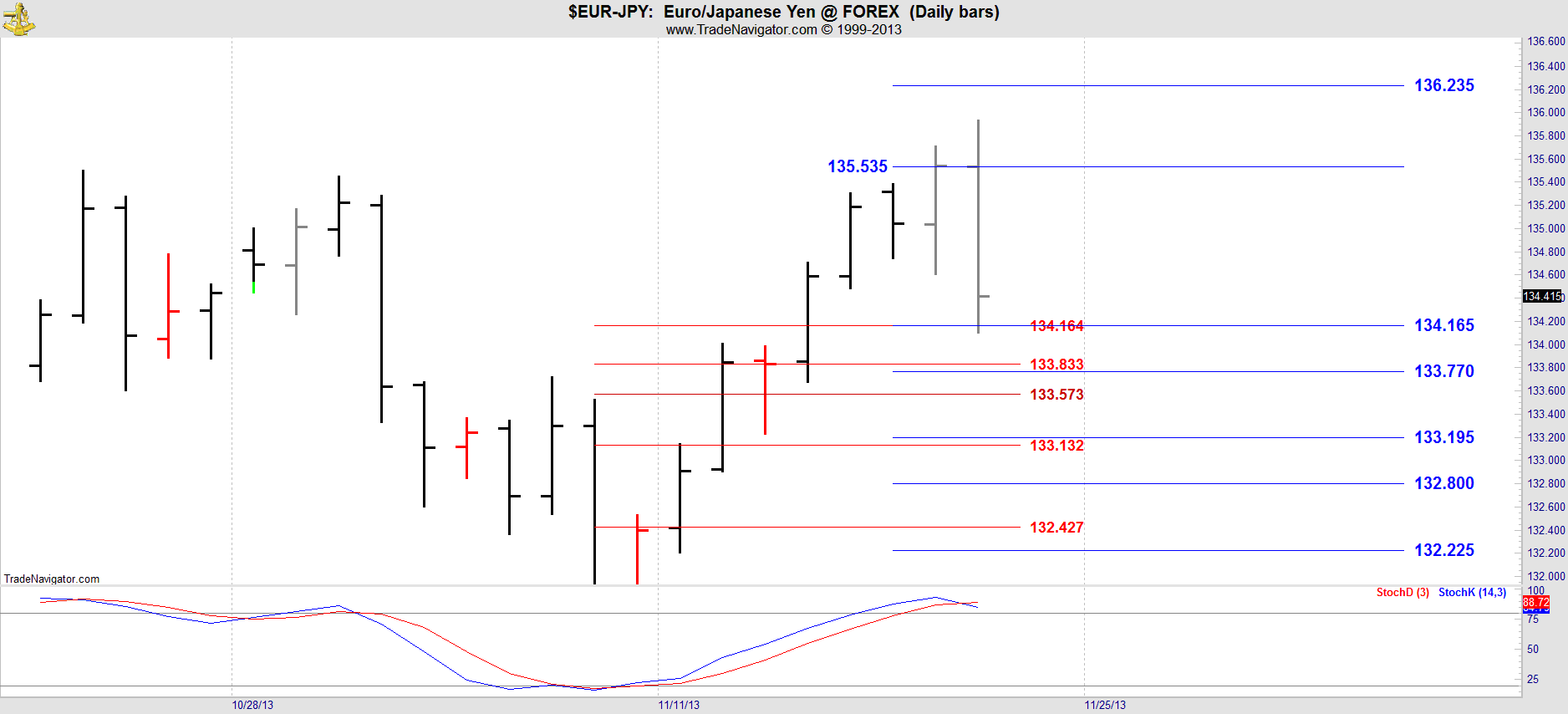 DC target recognition is valid on a bar high/low OR at the close. Tuesday’s close was at 135.540 against the DC Blue line at 135.535 so just 5 ticks variance. And that is target recognition.