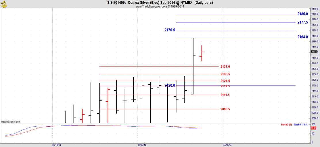 I have left the old Blue line at 2420 on this chart. The next number was 2164 with nothing in between. The unusually big gap told us that if the move was up, it would be big. And so it was with Thursday’s bar making its high at 2163!! You can’t make this stuff up.