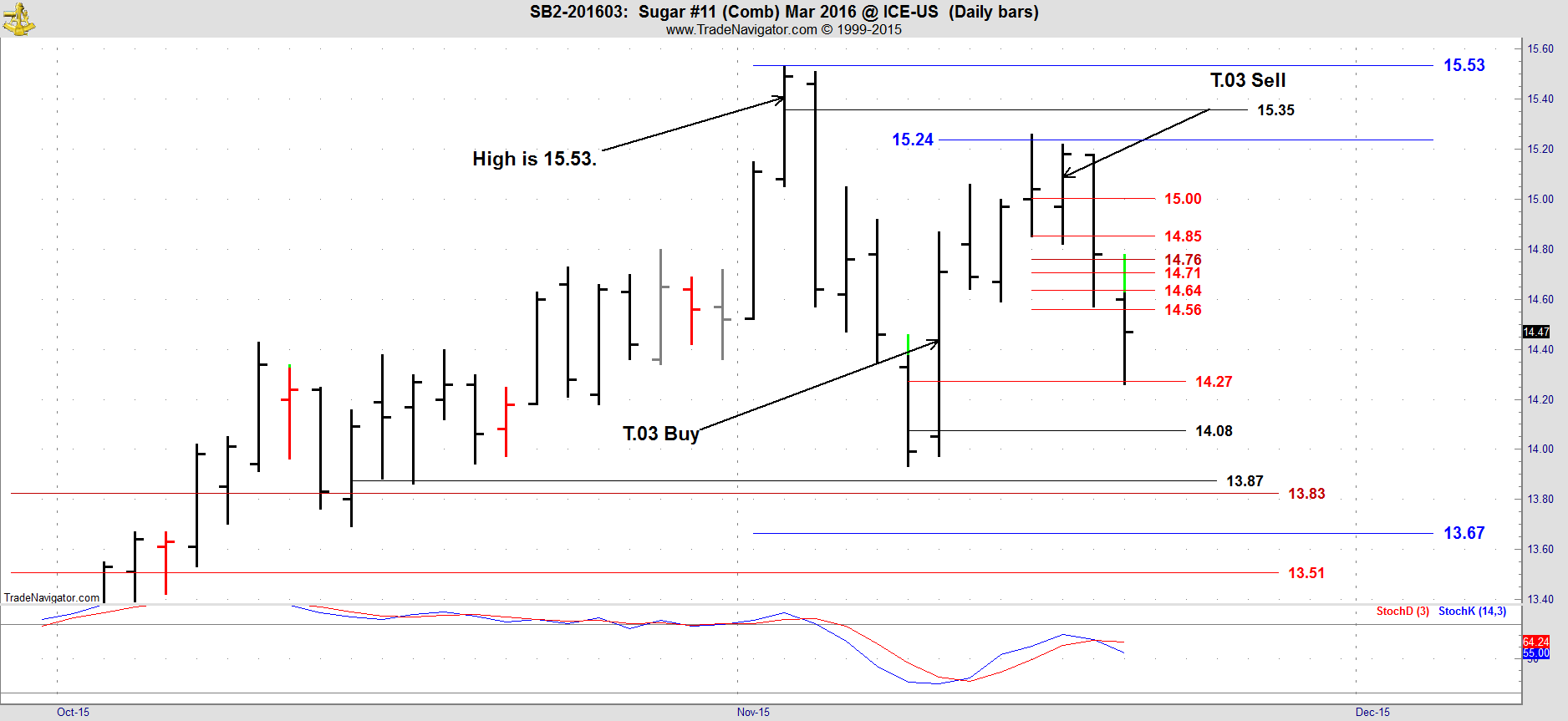 The 15.24 Blue line comes from a minor sequence which was not on your Charts but it set up the T,03 Sell signal posted for 11/16. Always check the DC Trade Program for current entries.