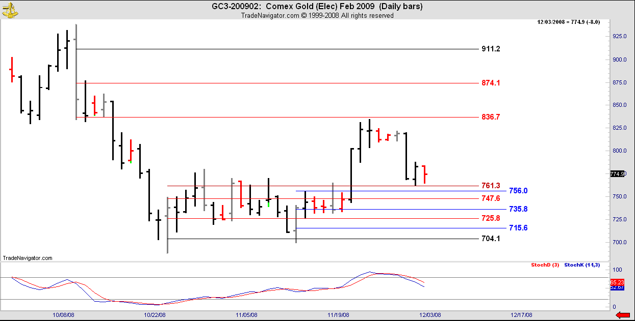 This is the February 2009 contract. February is now the front month in Gold. Note that Gold is well off its lows as DX is trying to regain its highs. While still ruled directionally by DX there are subtle shifts showing more strength in Gold.