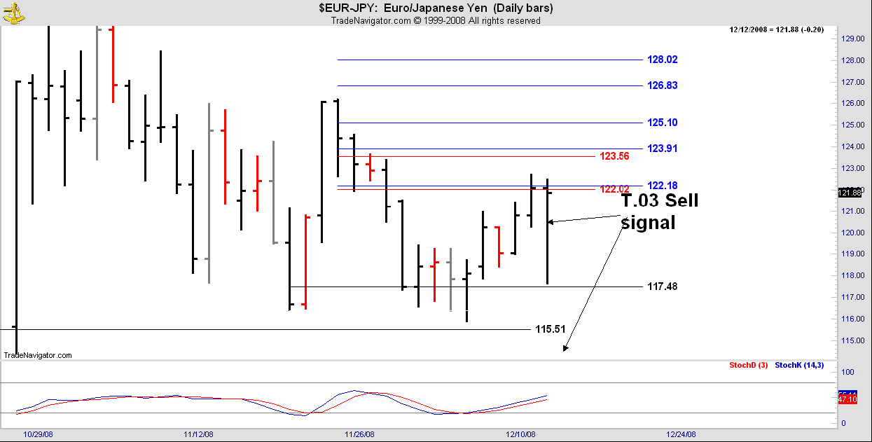 Here is a really nice example of short term trading with the T.03 signals. For Friday, we had a T.03 sell signal for this market. With the slow stoch in the middle of its range it was likely to be a shorter term turn rather than a terminal top. Entering from just the daily bar ie the lazy way, there was 254 points profit at the low. Did you move your stops to protect profits?