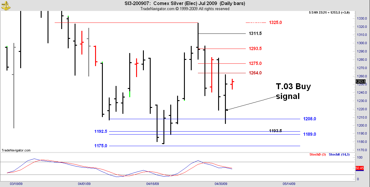 Fast intraday reversal on Friday in response to the T.03 Buy signal. Use your DC rets to find the minor ranges on a pullback. This is the July contract which is now the front month in Silver.