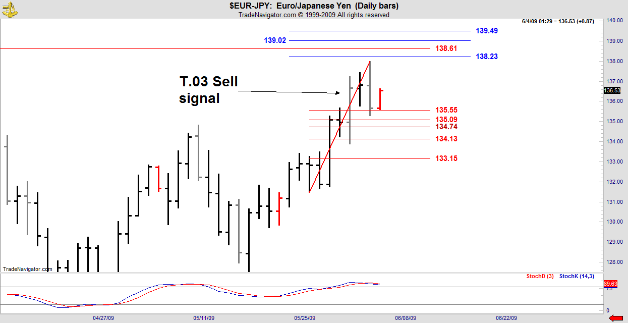 Here’s another where Monday’s T.03 Sell signal was elected a day late, but Wednesday also gave a standard DC reversal, an acceptable 23 ticks from the DC target. Retracement so far is small.