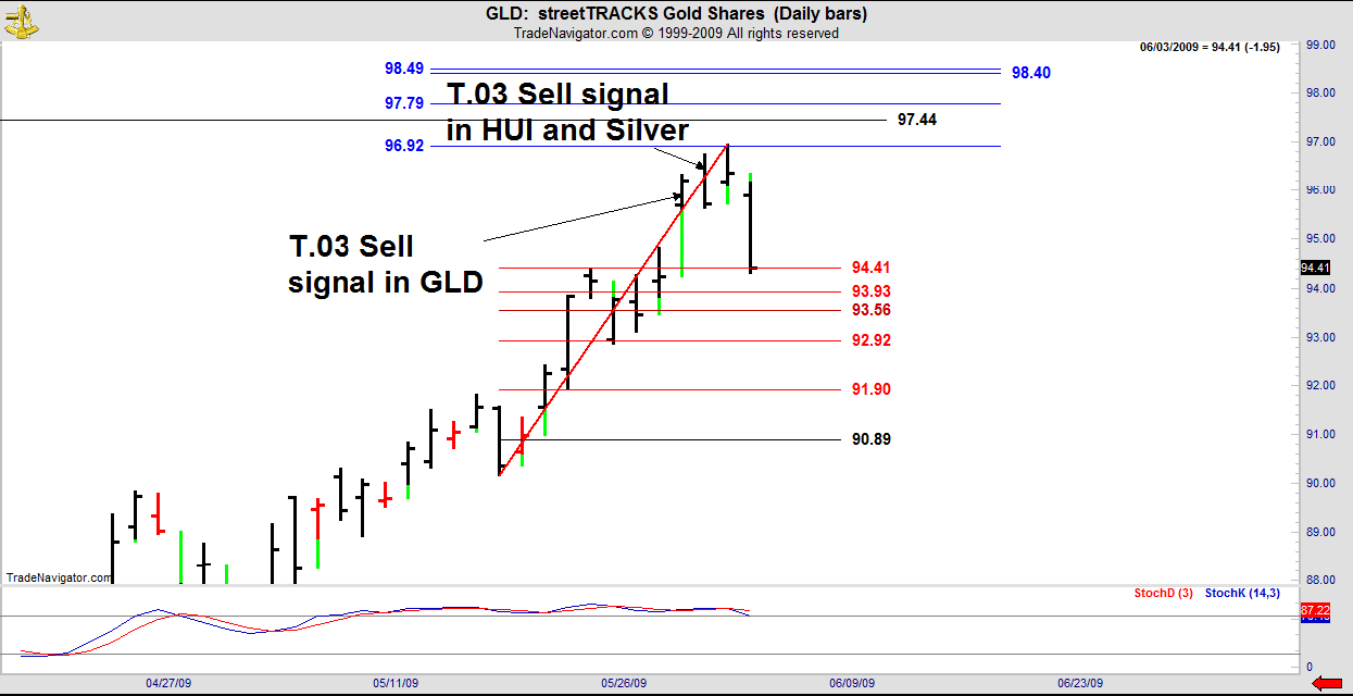 Friday’s T.03 Sell signal in GLD morphed into a standard DC reversal with a variance of just 5 ticks from the DC blue line. Monday’s Sell signals in HUI and Silver were a great heads up for the Sell signal here. Signals in others of the precious metals complex are valid for each other, such is the level of correlation in these markets.
