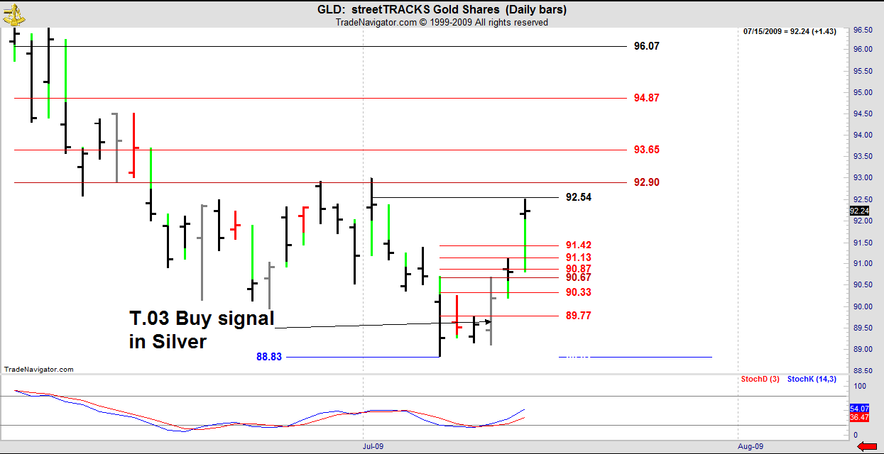 Markets know and respond to the DC numbers. Wednesday’s high was just 2 ticks from the number. Gold, Silver and HUI are closely correlated so a T.03 signal in one can be executed in the others. Here we see GLD’s response to Monday’s T.03 Buy signal in Silver.